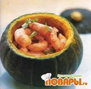 Перемешиваем, добавляем креветки и базилик и прогреваем. Приправлять специями следует по вкусу. Выкладываем креветки в готовую испеченную тыкву и посыпаем зеленью кориандра и базилика.