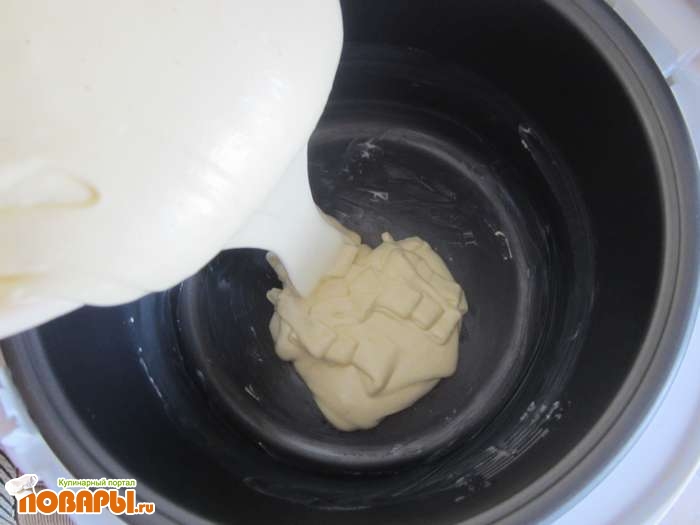 Закрываем мультиварку и выставляем время выпекания 65 минут. когда тесто будет готово, достаем его из мультиварки и переворачиваем. Основная часть слив окажется на верху пирога.