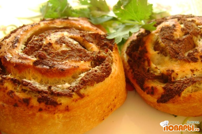 Тесто раскатать в большой пласт, намазать паштетом всю поверхность. Свернуть рулетом. Нарезать на кусочки шириной 3-4 см. Поставить булочки в разогретую духовку, выпекать в течении 20 минут.