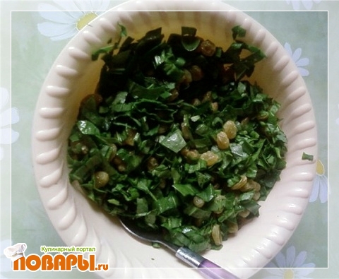Начинка: Изюм замочить на час в горячей воде. Щавель промыть и нарезать. Смешать с изюмом, добавить ложку сахара и чайную ложку крахмала.Перемешать