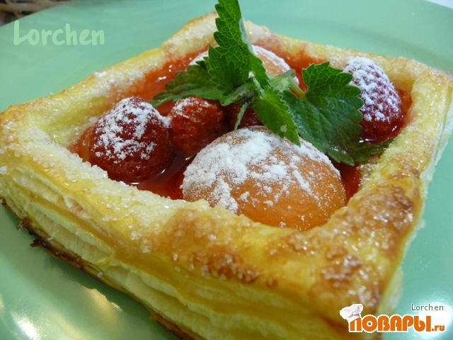 Во внутренний прямоугольник положить клубнику и половинки абрикос.