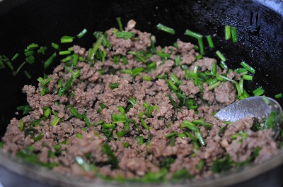 Фарш выложить на обжарку, жарить до полуготовности, после выложить мелко нарезанный джусай или репчатый лук)мелко нарезанный), и жарить до готовности. Ее забудьте добавить соль и черный перец.