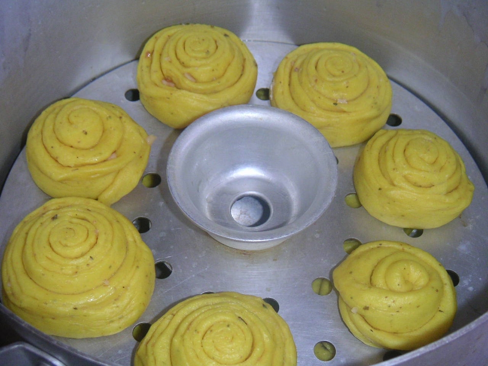 Раскатываем всё тесто одной лепёшкой,0,5 см,смазываем подсолнечным маслом,посыпаем приправами,(кто что любит)можно дроблёными орехами. Я всегда делаю по-разному. Заворачиваем аккуратно релетом.Жгут нарезаем по 5 см,ставим в мантышницу,разрезом вниз,немного разкрывая ,чтобы получилось похоже на розочки.Ставим варить над кипящией водой пр.на 30 мин.