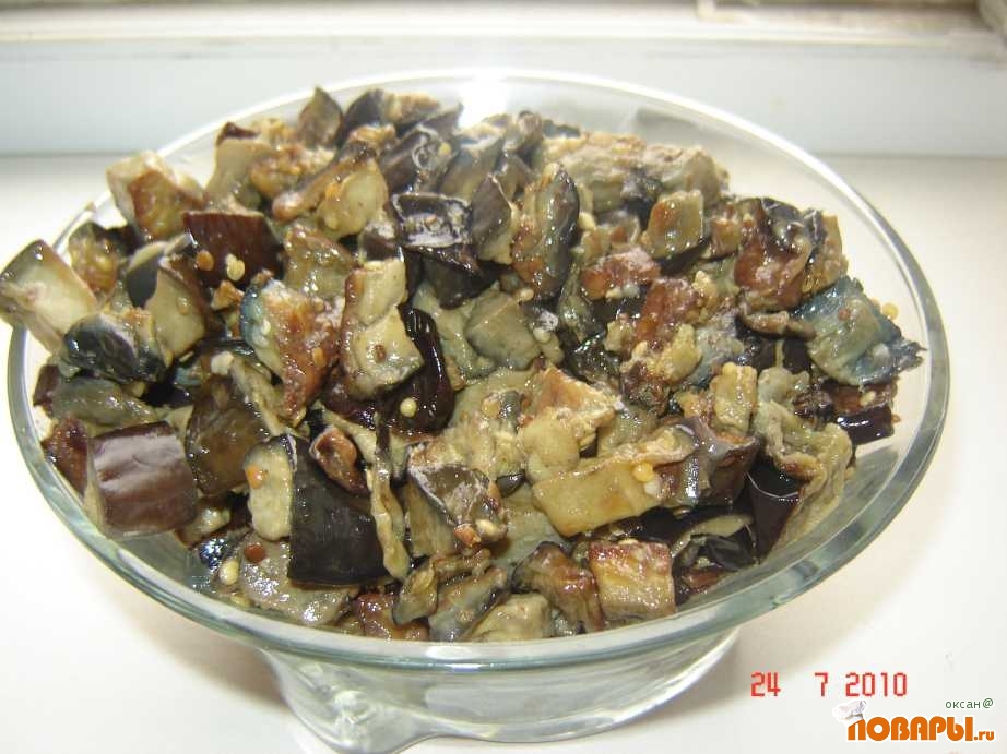 На сковороде разогреть растительное масло, выложить баклажаны и обжарить их до готовности. За 8-10 минут до окончания приготовления раскрошить в баклажаны грибные кубики, а буквально перед тем, как выключить газ, добавить измельченный чеснок.