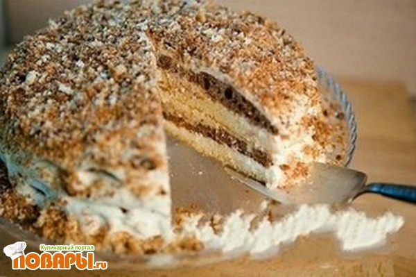 Сверху торт можно присыпать орехами или же бисквитной крошкой. Ставим торт в прохладное место на несколько часов пропитаться.