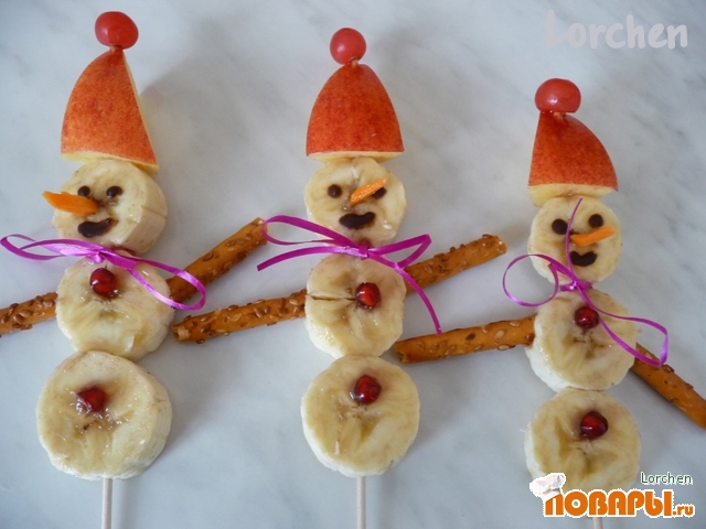 Банан порезать на кругляшки. Надеть на шпажку по 3 шт. Это "тело" снеговиков.