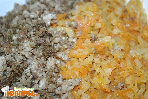 Обжарить капусту с морковью, добавить воду, потушить до мягкости. Куриный фарш также обжарить, все смешать. Посолить, поперчить.
