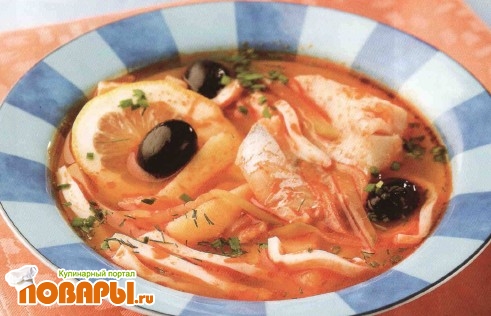 В конце варки добавьте нашинкованных соломкой кальмаров, оливки, перец, посолите и варите 3-4 минуты.