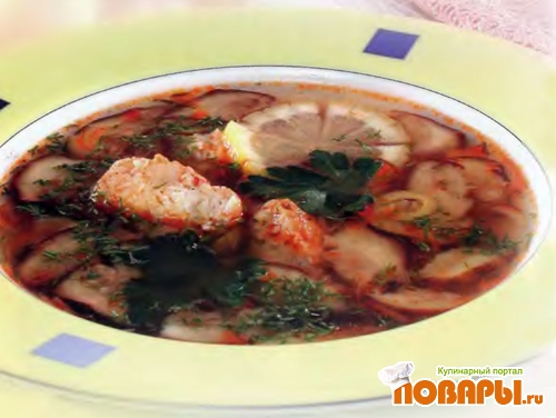 Рыбу нарежьте кусками, припустите с маслом, томатным пюре и очищенными от кожицы огурцами; положите в бульон и варите на слабом огне до готовности.