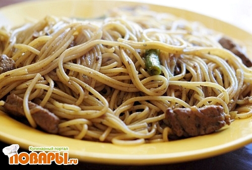 Перед тем как добавить спагетти в общее блюдо нужно мясо и стручковую фасоль посалить, добавить кардамон (5-7 штучек, молотый), базилик сухой- можно свежий мелко порубленный, куркума (ту которую путают с шафраном). Соль и перец черный по вкусу. Все хорошо перемешать.