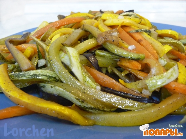 Овощи нарезать в виде спагетти, используя специальную терку, (у баклажана и кабачков использовать только слой с кожицей).
