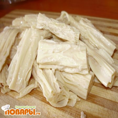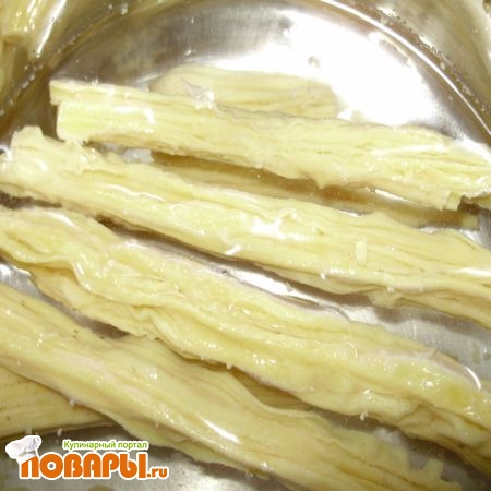 Бобовую спаржу «Юнн» (аналог мяса из сои) вымачиваем до гибкости. Свежим «соевым палочкам» (за рубежом их знают именно как «палочки») нужно меньше времени расслабляться и напитываться водой, чтобы стать съедобными. Можно определить замоченный сухой полуфабрикат на всю ночь.