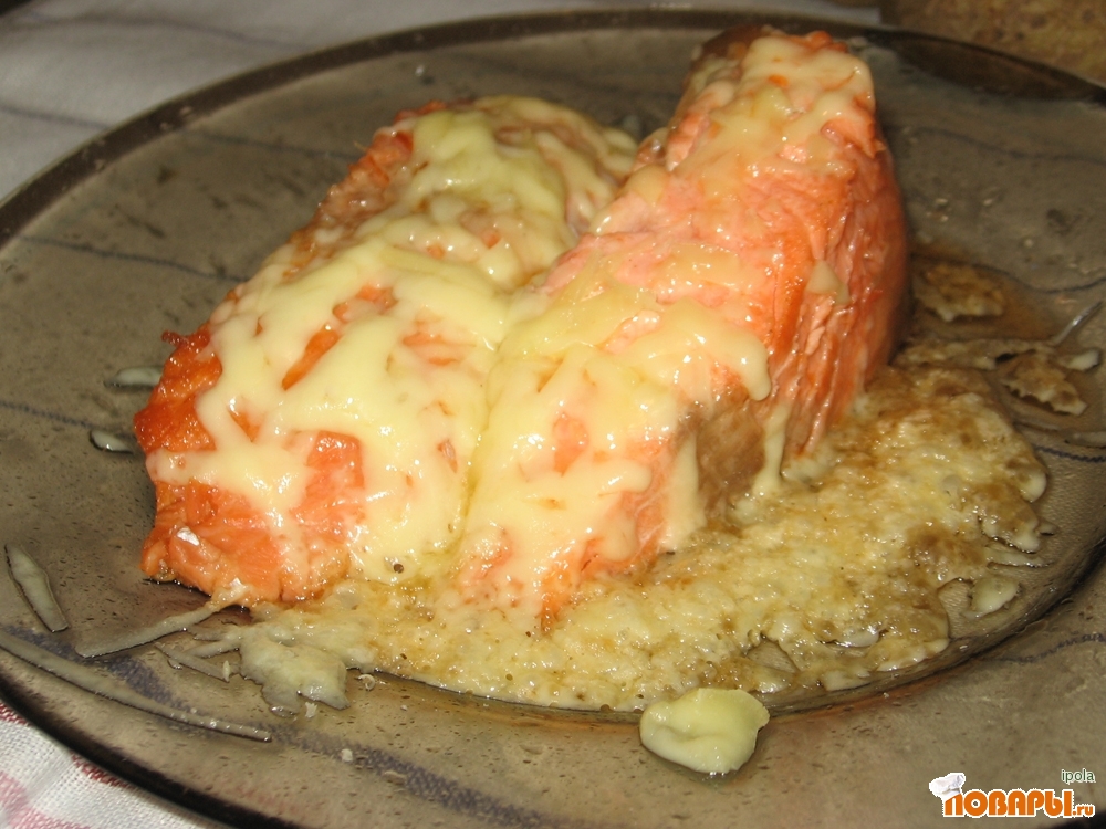 Сёмгу обмыть, отделить от кожицы, нарезать на стейки. Слегка посолить, поперчить. Посыпать тёртым сыром.