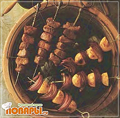 Нанизать мясо на 4 шампура, а лук и картофель - на другие 4 шампура.