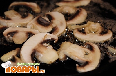 В подогретую сковороду добавить подсолнечное масло и выложить на обжарку грибы, жарить помешивая минут 10.