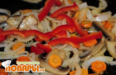 Как только грибы хорошо подрумянятся присоединить к ним лук и морковь, жарить до 70% готовности и добавить на обжарку сладкий перец.
