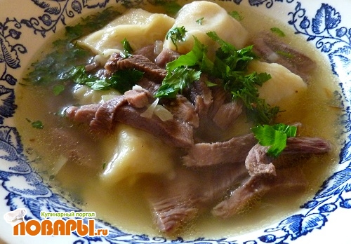 Как вариант, можно отварить рулетики в бульоне с обжаренным луков, разлить по тарелкам, а потом добавить порезанный язык.