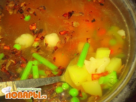 После того как картофель доведен до готовности добавляем в бульон жареный лучок и замороженные овощи. Доводим до кипения и оставляем покипеть 10 минут для доведения до готовности замороженых овощей.