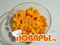 Добавьте в кастрюлю нарезанную тыкву и мелко нарезанную картошку. Залейте содержимое кастрюли таким количеством бульона, чтобы жидкость покрыла тыкву.