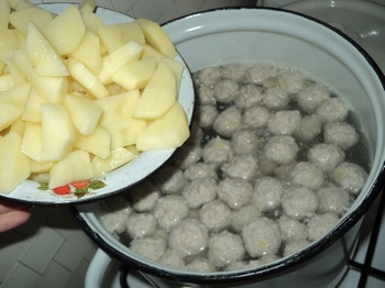 Тем временем режем картофель брусочками, бросаем в воду, когда фрикадельки покипят уже минут 15.