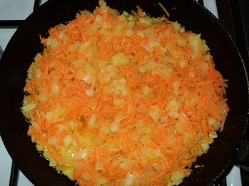 Потом добавляем поджарку в кастрюлю. Минут через пять бросаем вермишель(я использовала паутинку).