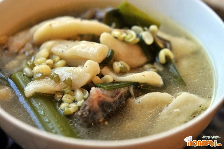 Как только бульон будет готов и мясо сварится, положите отвариваться проросший маш. В среднем на это уйдет минут 20. Не забудьте посолить.