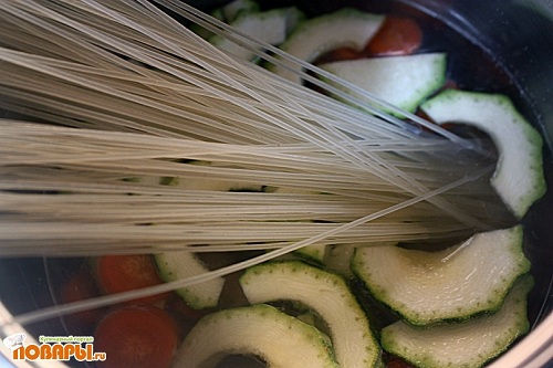 Затем добавить рисовую лапшу, соль, имбирь и молотый черный перец , варить до готовности около 5 минут пока овощи не станут мягкими.
