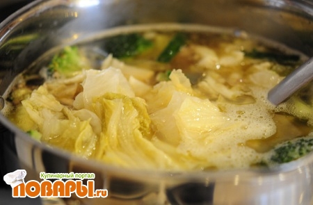 В это время подготовить пекинскую капусту, порезав ее кубиками или листами размером пол ладони. Выложить в кастрюлю.