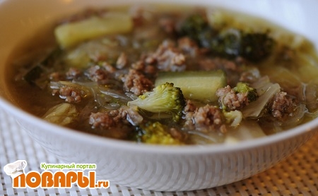 Брокколи поделить на кустики и выложить в общую кастрюлю. Добавить соль и соевый соус, перец черный. Вода закипит, варить еще минут 10 и выключить.