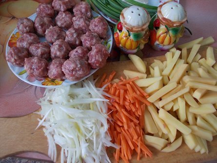 Дождавшись, пока картофель сварится до полуготовности, посолите воду и засыпьте тефтели. Дайте покипеть минут 5 и засыпайте макароны (если это гнезда, то немного распотрошите их).