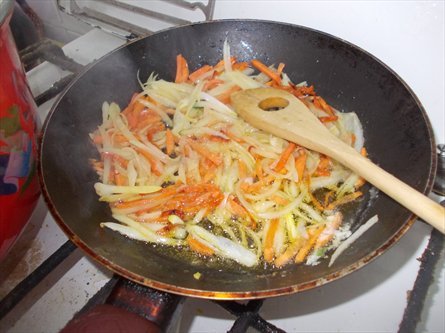 На сливочном масле зажарьте лук и морковь.