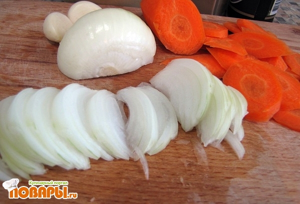 Подготовьте овощи. Картофель порежьте полукруглыми кусочками, морковь круглыми. Лук порежьте полукольцами вдоль луковицы, как это принято в азиатских странах. Чеснок мелко порубите ножом.
