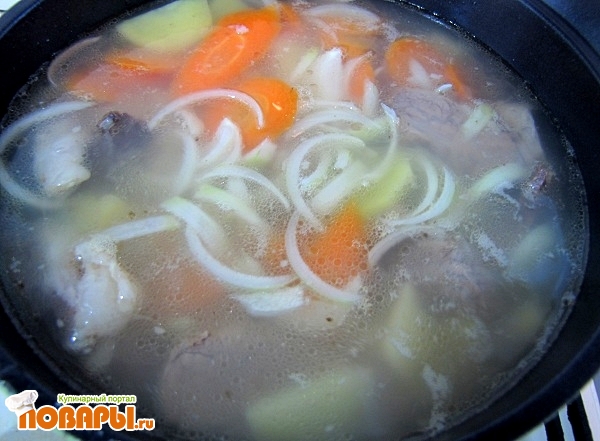 Достаньте мясо из кастрюли. В бульон высыпьте картофель и морковь. Мясо разделайте на плоские длинные кусочки и добавьте обратно в суп.