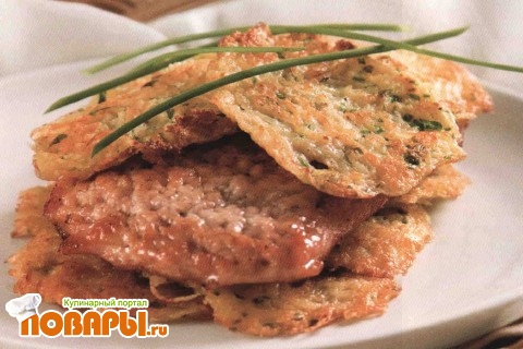 Из готовой массы жарьте тонкие лепешки до образования румяной корочки. Свинину разрежьте на порционные куски, отбейте их, посолите, поперчите.