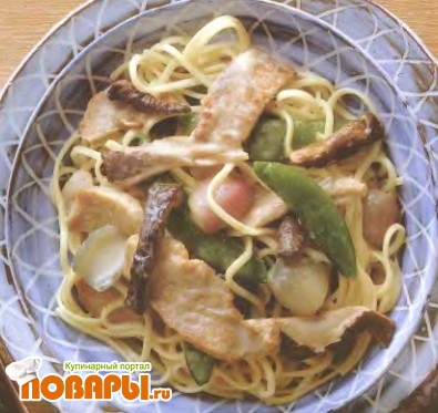 С сушеными грибами это блюдо ароматнее. Если будете использовать только свежие, то добавьте лишних 60 г и замените воду крепким куриным бульоном. Херес и эстрагон придают пикантность густому сливочному соусу, объединяющему свинину, яичную лапшу, грибы и стручки мозгового гороха в единый вкусовой букет.