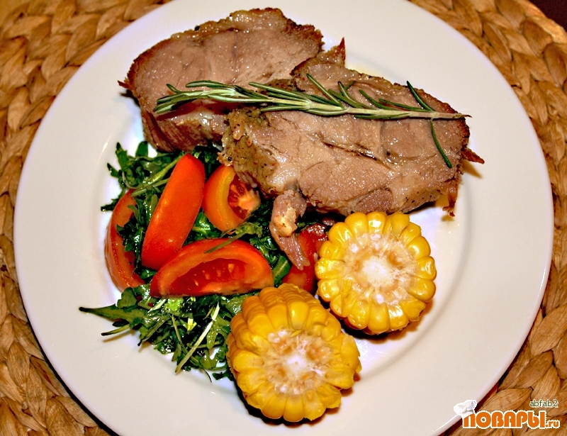 Спустя полтора часа приступаем к приготовлению гарнира. В заранее подготовленную кипящую воду бросаем початок кукурузы и варим до готовности, достав его из воды, солим и поливаем оливковым маслом. Рукколу и помидоры промываем.