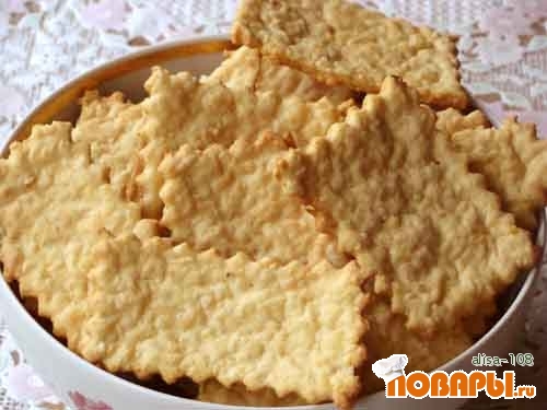 Замесить крутое тесто. Тесто отправить в холодильник на час. Разделить тесто на несколько частей и раскатать в пласт. Нарезать на небольшие прямоугольники и выпекать в духовке, предварительно разогретой до 200 градусов, до золотистого цвета.