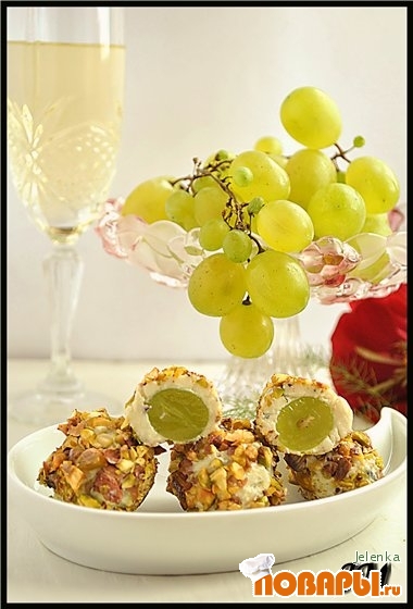 Каждую виноградинку аккуратно обвалять в сырной смеси, а затем - в фисташках. Охладить.