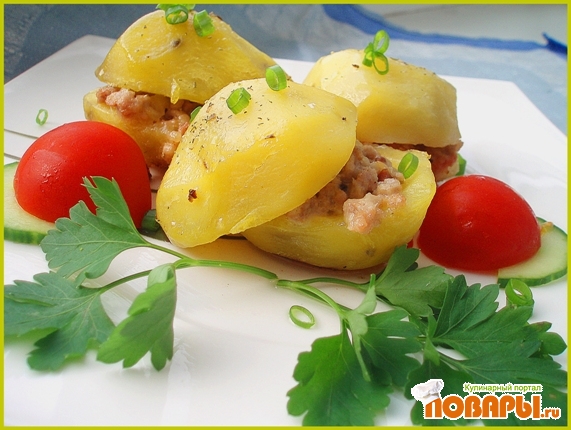 Каждый картофель разрезать пополам и ложкой вынуть середину. В получившееся углубление положить начинку. Соединить половинки.