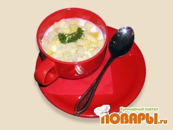 Пусть суп потомится на грани закипания (активно бурлить ему ни в коем случае давать нельзя) еще минут 20. Перед самой подачей влить пол-литра не слишком густых сливок, предварительно подогретых минуту-другую в микроволновке, перемешать буквально одним размашистым круговым движением и разливать по просторным белым тарелкам, стараясь не разрушить красивую бело-желтую спираль, которая там получится.