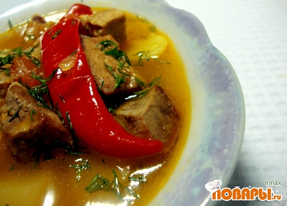 Затем налить 2,5-3 л. мясного бульона или воды,посолить, дать закипеть на большом огне. Положить 1 стручковый острый перчик и варить 1 час на слабом огне. Огонь выключить, добавить мелко нарезанную зелень, закрыть крышкой и дать настояться пол часа.