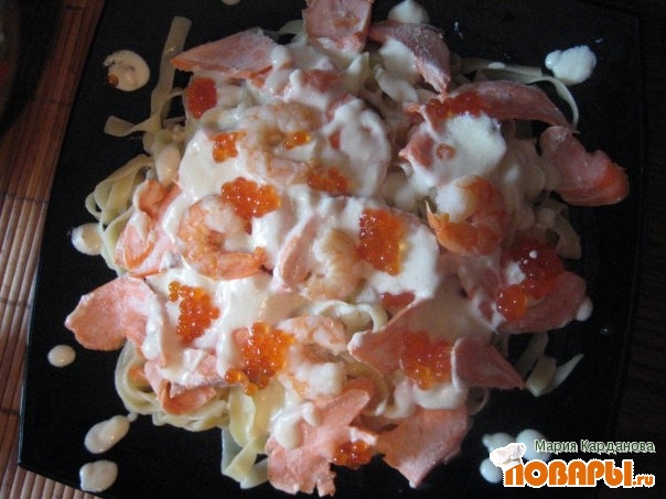 Выложить пасту на блюдо, сверху посыпать рыбой и креветками