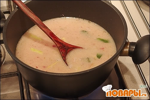 Вливаем примерно треть куриного бульона. Приправляем рыбным соусом, соком лайма и пальмовым сахаром, доводим до кипения и варим 5 минут. Переливаем соус в блендер и измельчаем до однородного состояния. Я измельчала прямо в кастрюле, используя погружной блендер. Добавляем оставшийся перчик, лемонграсс и листья каффир-лайма. Вливаем оставшийся бульон и варим еще 3-5 минут.