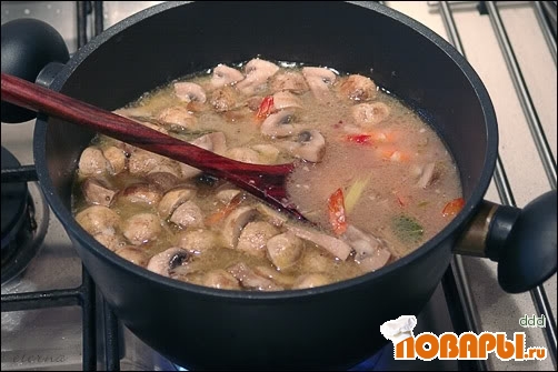 Добавляем грибы, варим 3 минуты. Затем выкладываем в суп креветки и даем покипеть 1-2 минуты.