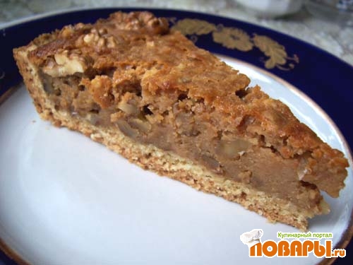 Тесто раскатать и выложить им форму невысокую (20 см). Смазать основание сгущенкой и выложить орехи слегка измельченные. Вылить начинку. Украсить бока листиками из теста. Выпекать при 175 30-40 минут. (Начинка должна схватиться).