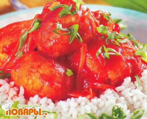 Из полученной массы сформовать тефтели, обвалять их в панировочных сухарях, слегка обжарить на сковороде. Затем залить томатным соусом и запечь в духовке в течение 7 минут при 180 "С.