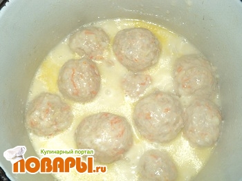 и добавляем к молоку небольшими порциями. Хорошо помешиваем, чтобы не было комочков. Добавляем соль и сахар. Как только соус загустеет, выключаем огонь. Добавляем его к тефтелям и тушим минут 30.