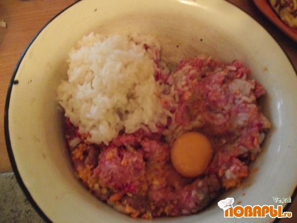В уже готовый фарш (кстати фарш можно взять любой) добавляем отваренный остывший рис, измельченную морковь с луком, яйцо, соль и перец