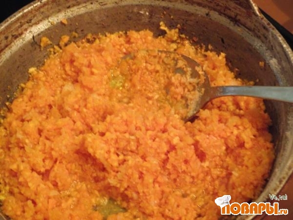 Для этого обжарим в отдельной посуде измельченные лук и морковь, затем добавим сметану,муку, соль, перец и помешивая потушим около 10 минут,