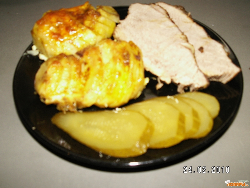 За это время чистим картофель, каждую картофелину режем на ломтики и чуть-чуть сдвигаем ломтики так, чтобы сохранилась форма картофелины. Раскладываем эту "растянутую" картошку в другой поддон, подливаем полстакана воды, солим, посыпаем специями (в картошку я люблю класть молотый мускатный орех), смазываем майонезом, плотно заворачиваем в фольгу весь поддон и ставим в духовку рядом с ногой.